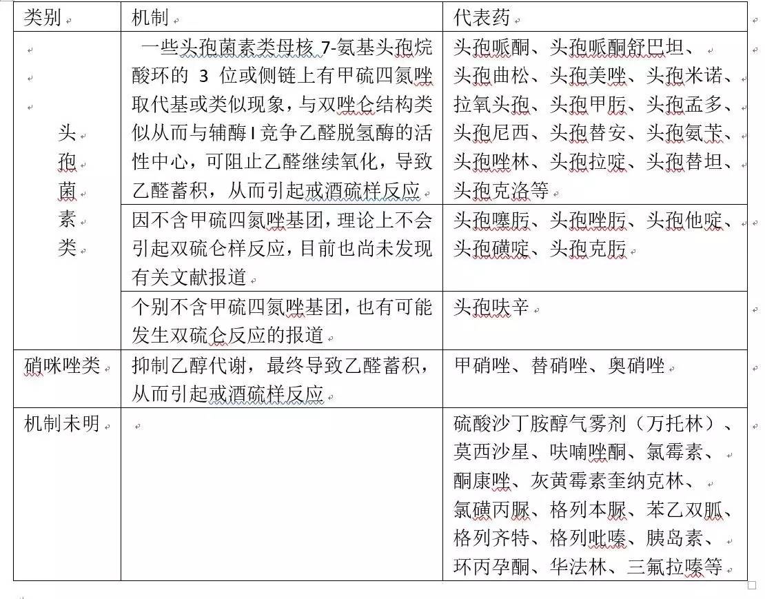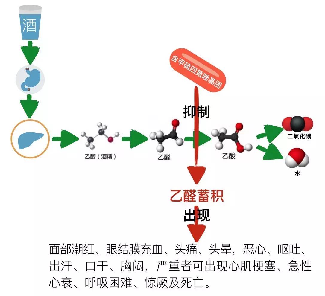 說到吃藥+喝酒要人命,大家比較熟悉的是使用************后喝酒要人命的藥源性雙硫侖樣反應!當然不是所有的************都會引起藥源性雙硫侖樣反應!一般都是含有甲硫四氮唑基團******才會引起!因其抑制肝臟中的乙醛脫氫酶,導致乙醇的中間代謝產物——乙醛代謝受阻,使血液中乙醛濃度增加而發(fā)生雙硫侖樣反應!